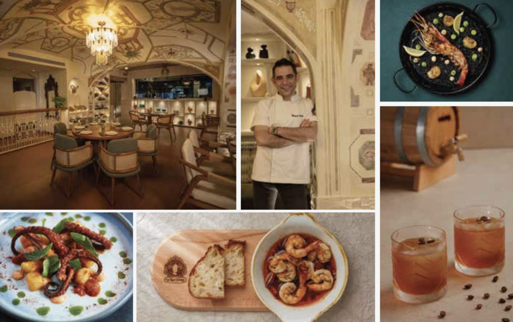 Inspired by Chef Manuel’s hometown, the UNESCO heritage city of Toledo in Spain, the restaurant boasts a colour palette reminiscent of an old town, featuring shades of beige, green, white, and brown. A magnificent art deco chandelier graces the central dome, casting a soft glow on the hand-painted murals depicting various facets of Spanish culture, setting the stage for the delightful dining experience ahead.