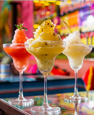 Groups can opt for shareable Muy Grande pitchers or even the theatrical Margarita Tower – a towering tribute to the Mexican way of celebrating everything with friends and fire.